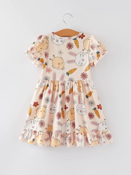 Easter Bunny Chick Print Puff Sleeves Girls Dress