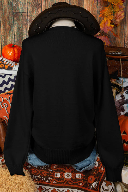Fall Boo Knitted Ribbed Edge Drop Shoulder Halloween Sweater