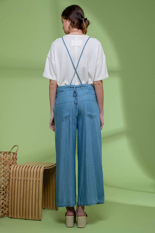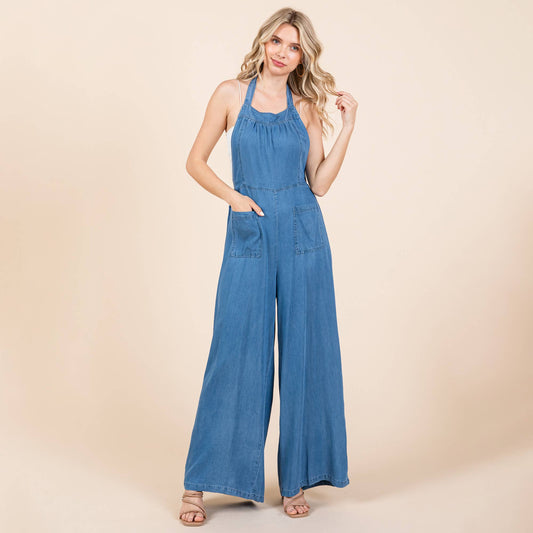 Chambray Open Back Halter Neck Wide Leg Jumpsuit