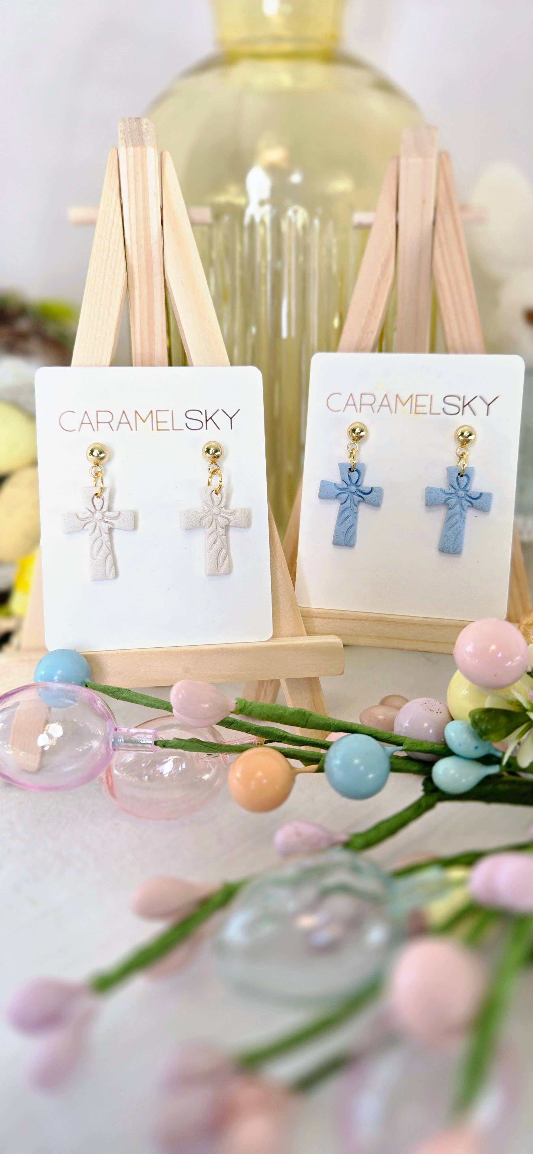 Handcrafted Easter Cross Earrings, delicately embossed with a daisy flower. Handmade from polymer clay. Stainless steel stud posts (hypoallergenic). Lightweight and comfortable for all-day wear. Approx. 1" in length. Designed with both meaning and style in mind. Please note: Because each piece is handcrafted, no two will be exactly alike—slight variations from the photos are natural and add to their uniqueness. Minor imperfections may occur in handmade polymer clay earrings, but they do not impact the overall quality or beauty of the piece.