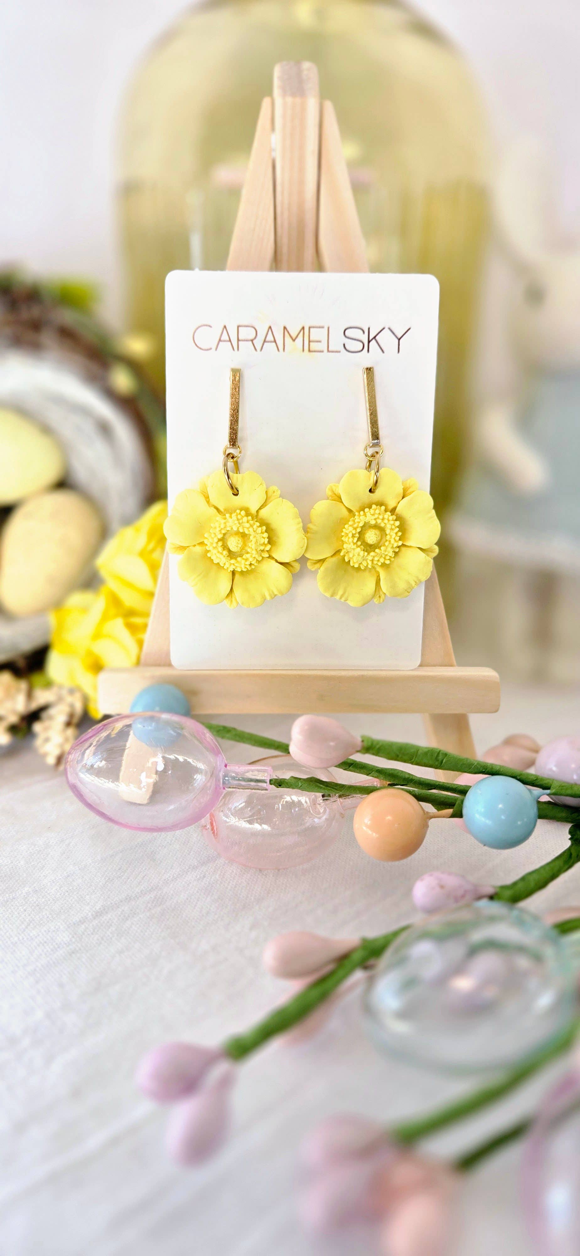 Beautiful yellow flower clay earrings. Each pair is crafted by hand, making them one-of-a-kind with slight variations that add to their charm.