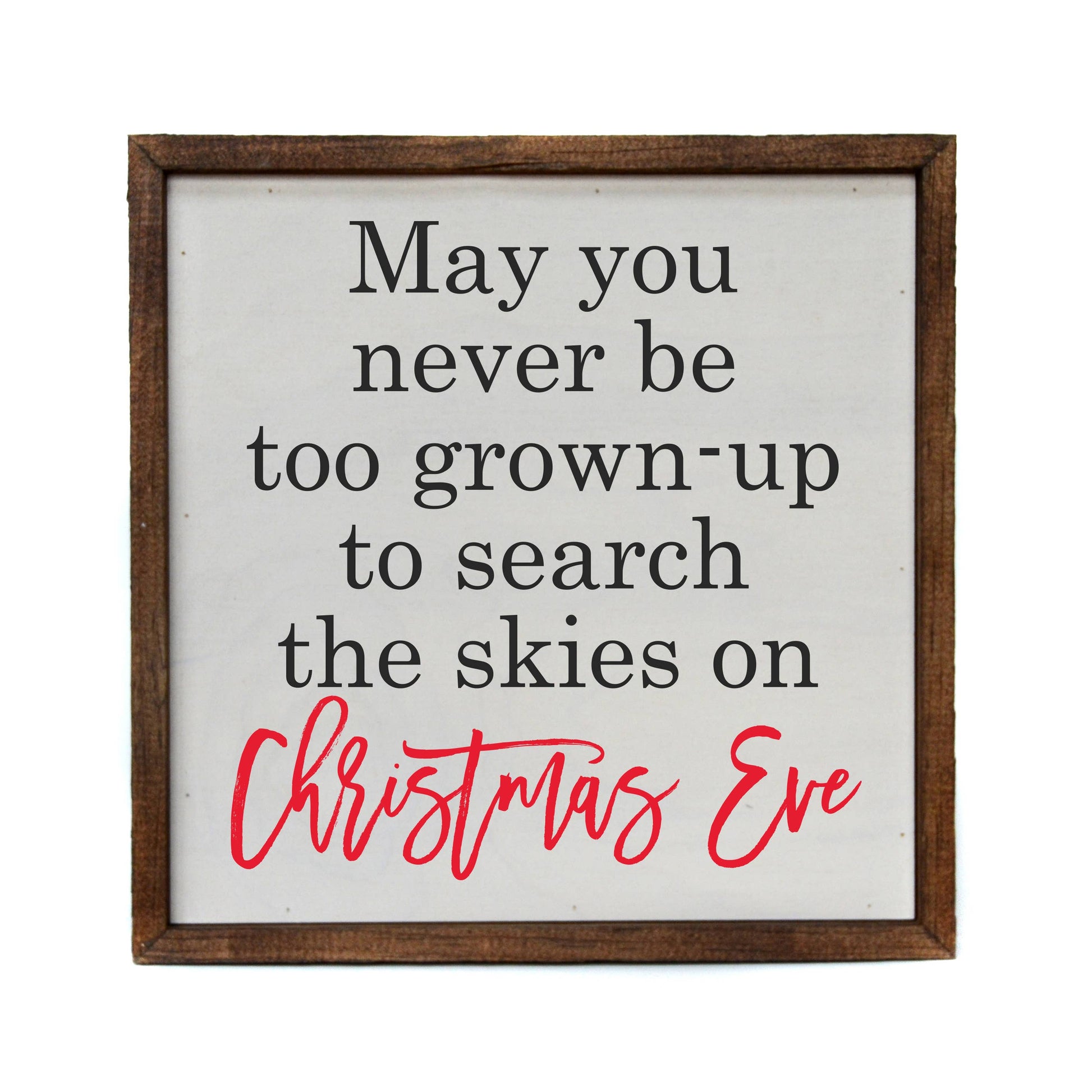 May You Never Be Too Grown-up To Search The Skies On Christmas Eve wood Christmas sign. All our signs are build into a wooden box frame with a rustic touch. Signs are hung directly off the frame or sit perfectly on a desk.