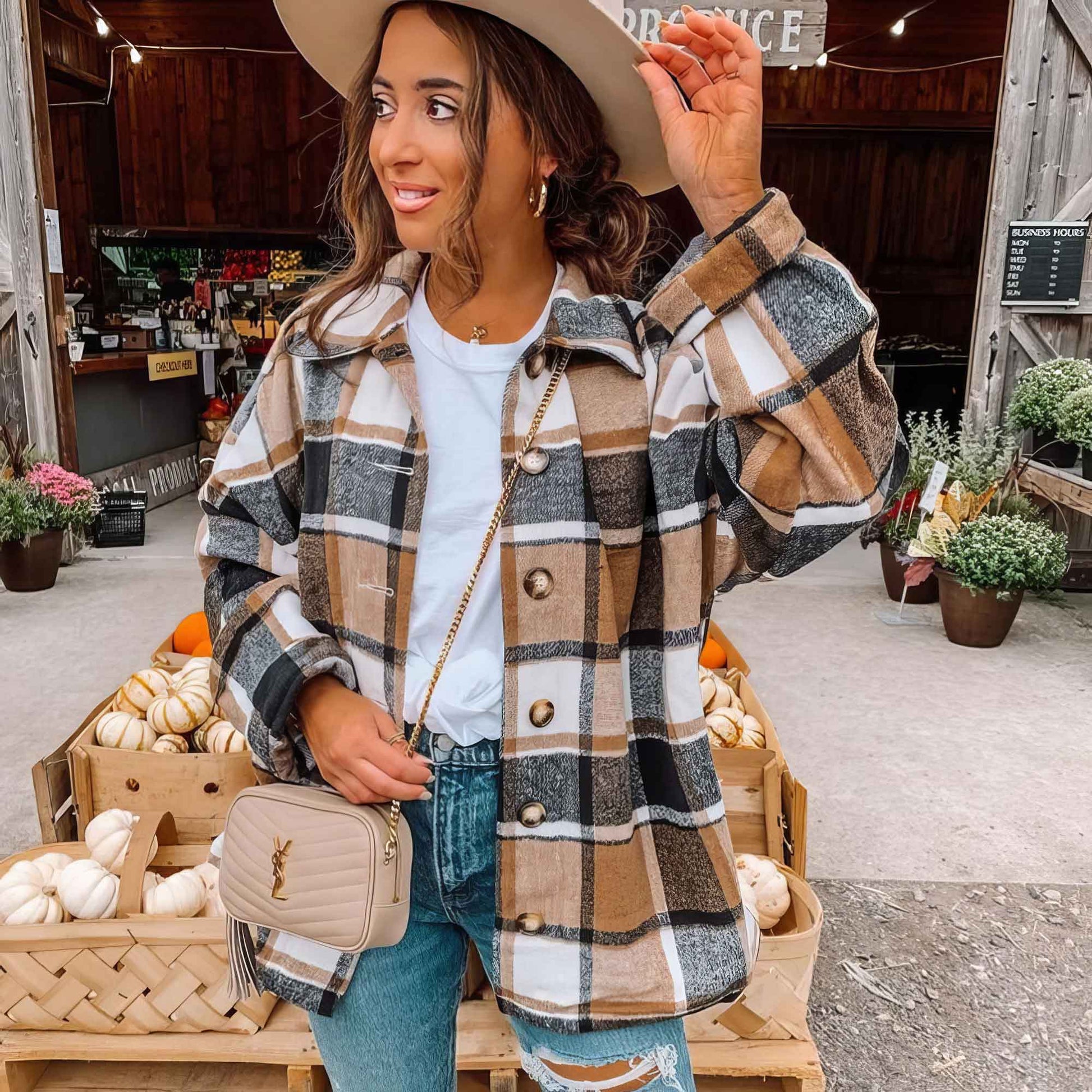 Feel cozy and stylish in our Fall Colored Flannel Shacket! This season features subtle, neutral Fall colors that make it super easy to style. Soft and comfortable, it's perfect for a western-inspired boho look or to pair with joggers for a casual chic style. .: