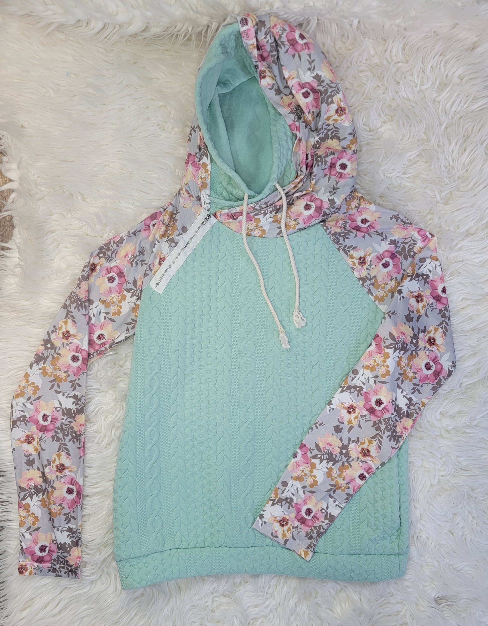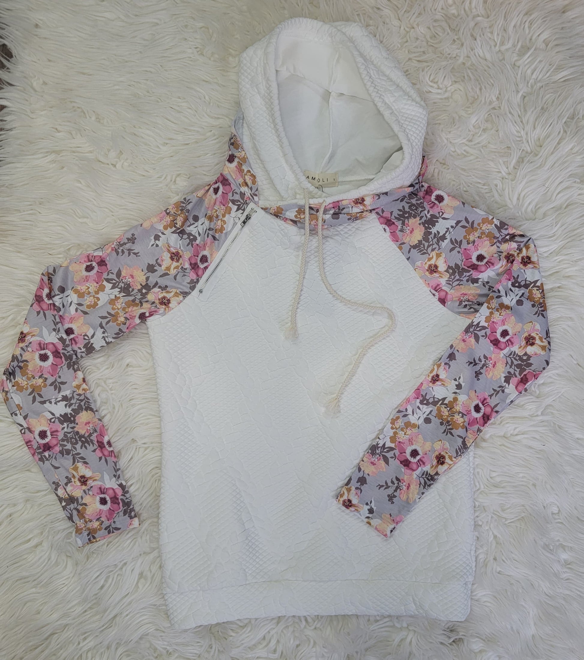 Amoli Pink Quilted Hoodie with Floral Sleeve and Front Zip Accent True to size Pattern: Floral/solid Features: Long sleeves, zip detail, drawstring, raglan sleeves, cable-knit texture Neckline: Hooded