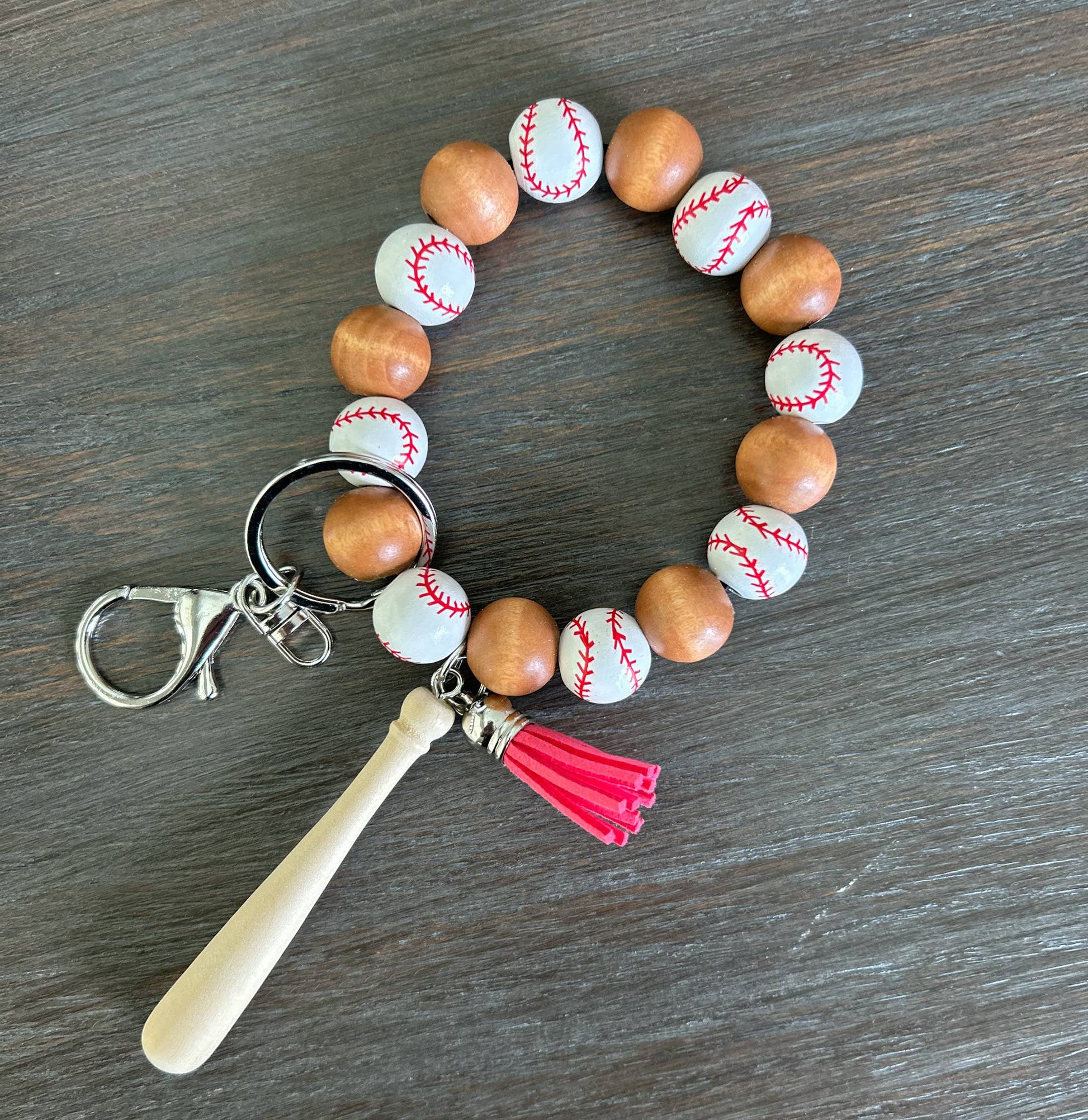 Introducing our stylish Wooden Beaded Baseball Wristlet Keychain with a charming wood bat attachment. This unique accessory is designed to showcase your love for baseball while keeping your keys secure and easily accessible.