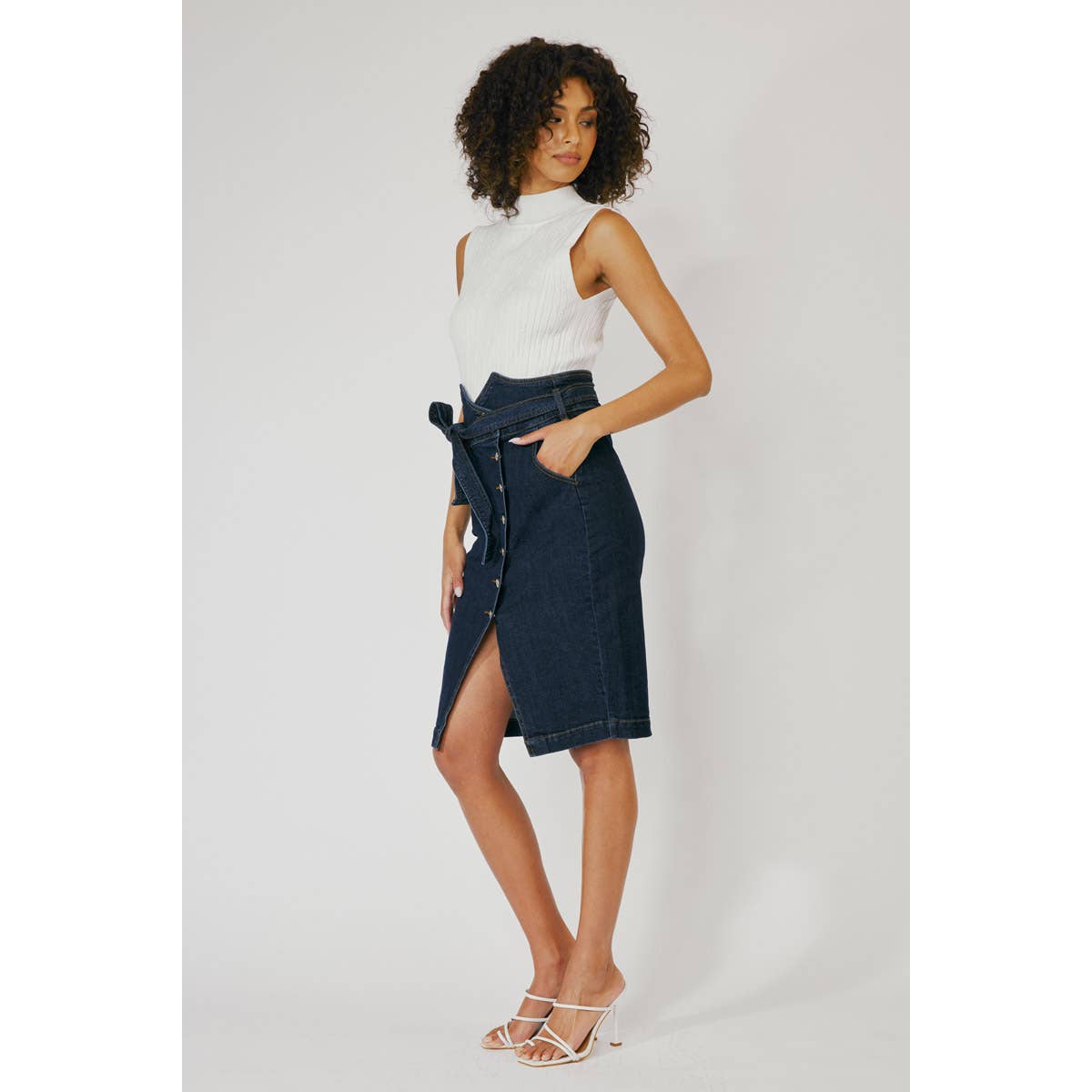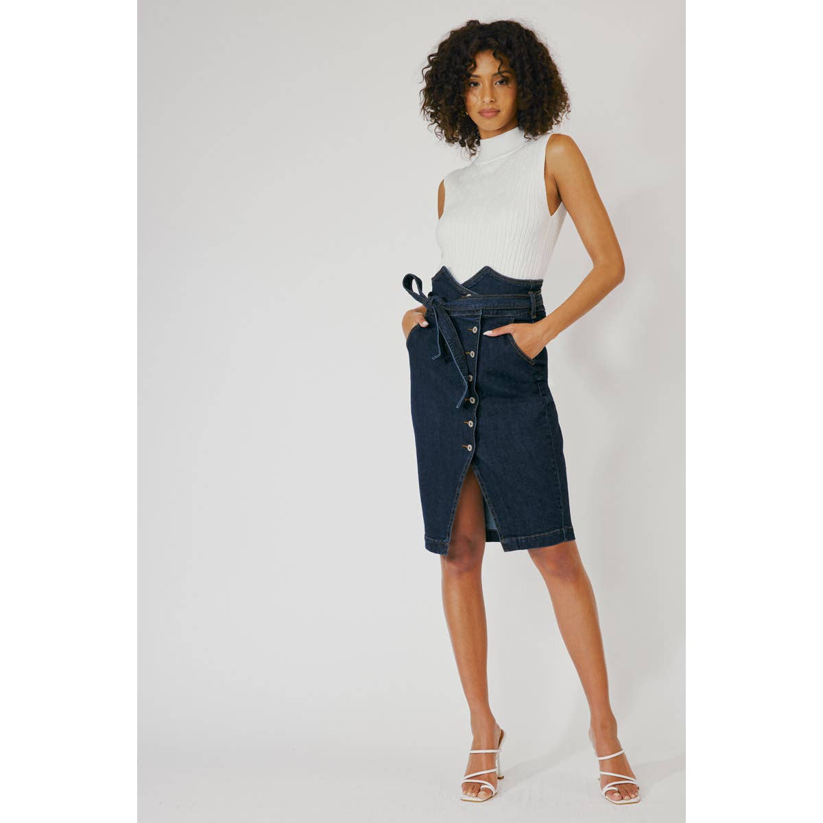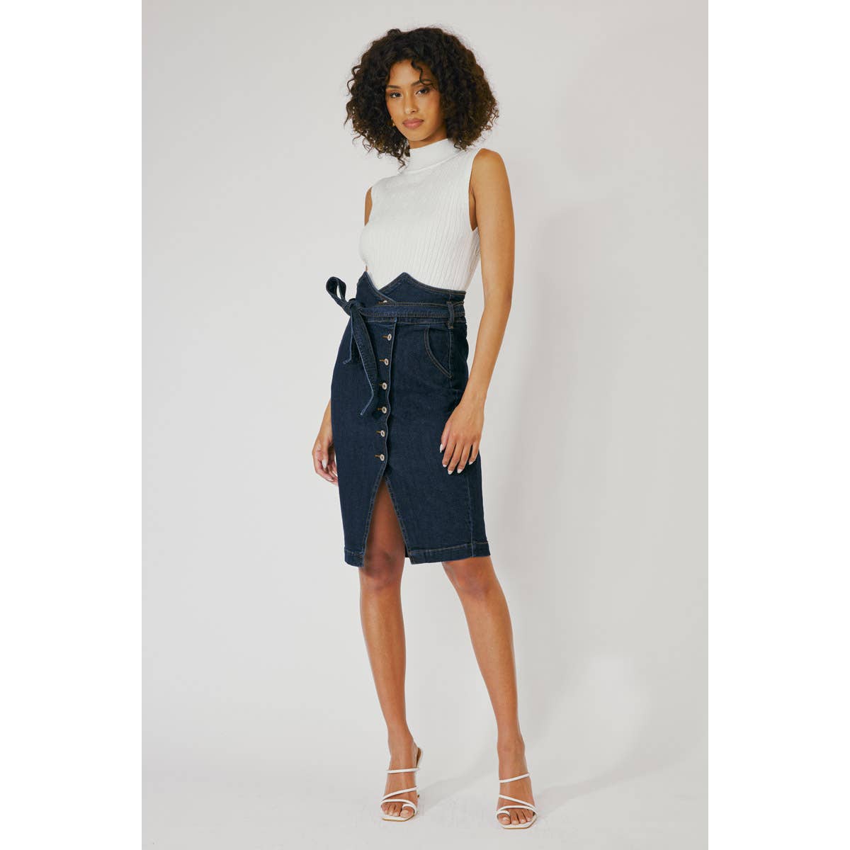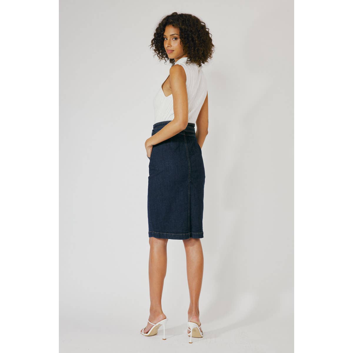 Jean midi skirt with comfort stretch and cute waistband detail. Great for a casual or upscale outfit.
