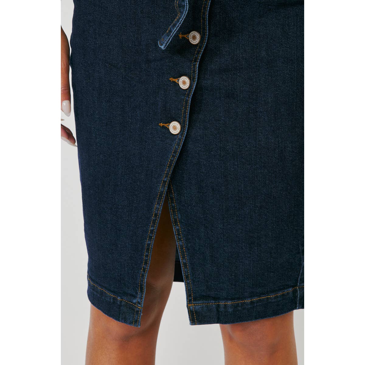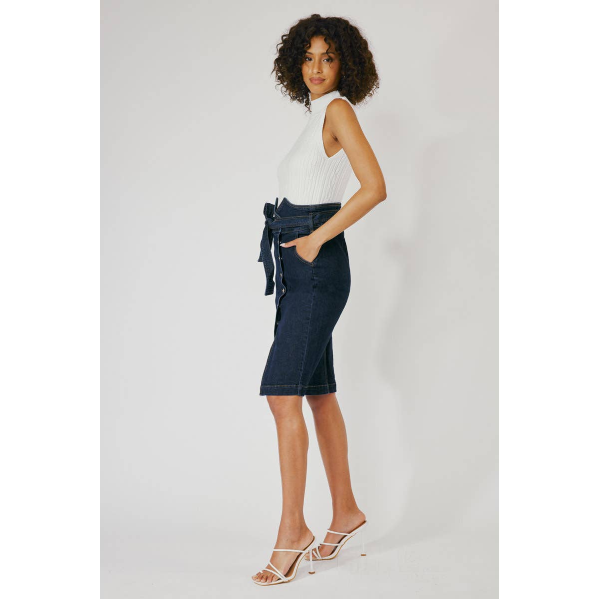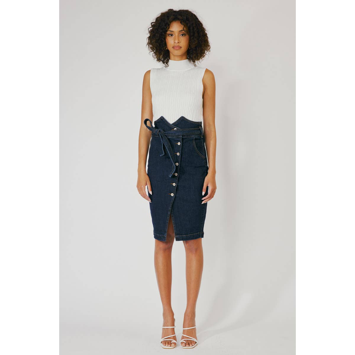 Jean midi skirt with comfort stretch and cute waistband detail. Great for a casual or upscale outfit.