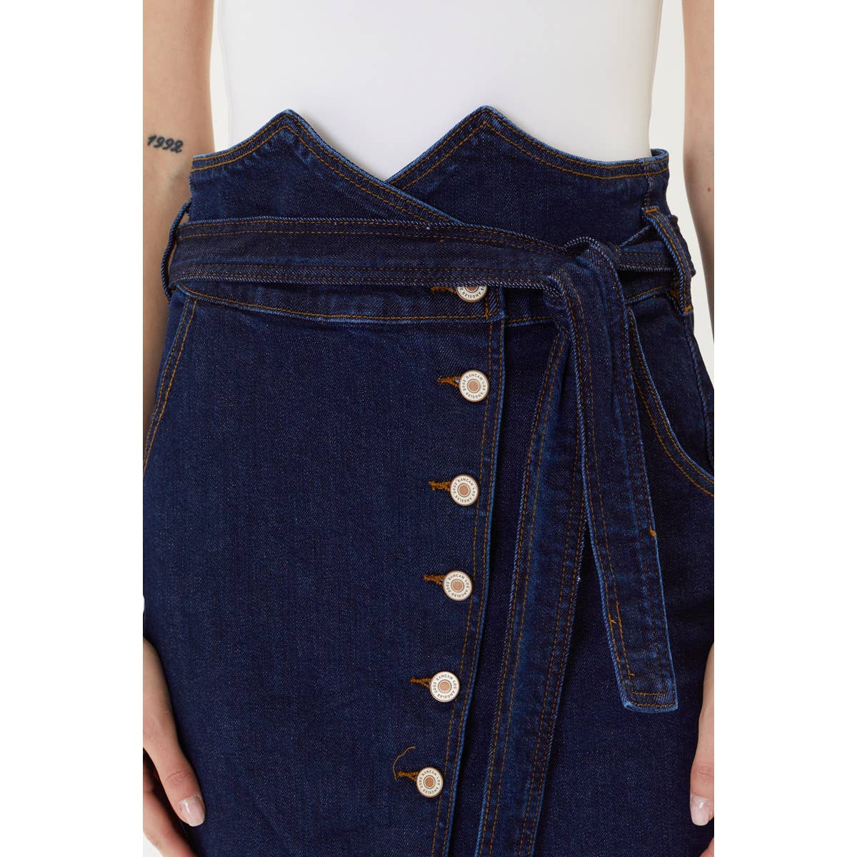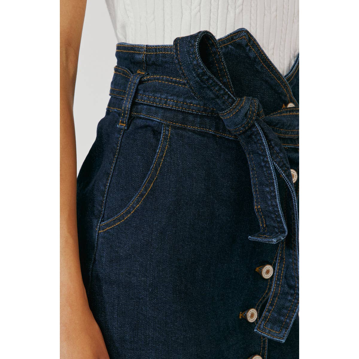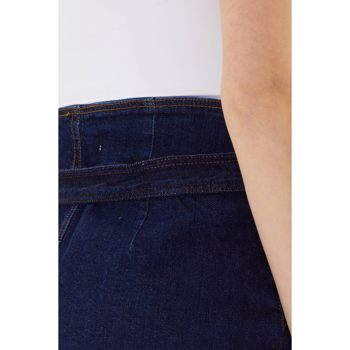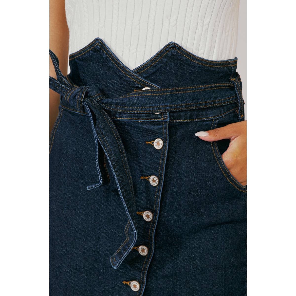 Jean midi skirt with comfort stretch and cute waistband detail. Great for a casual or upscale outfit.