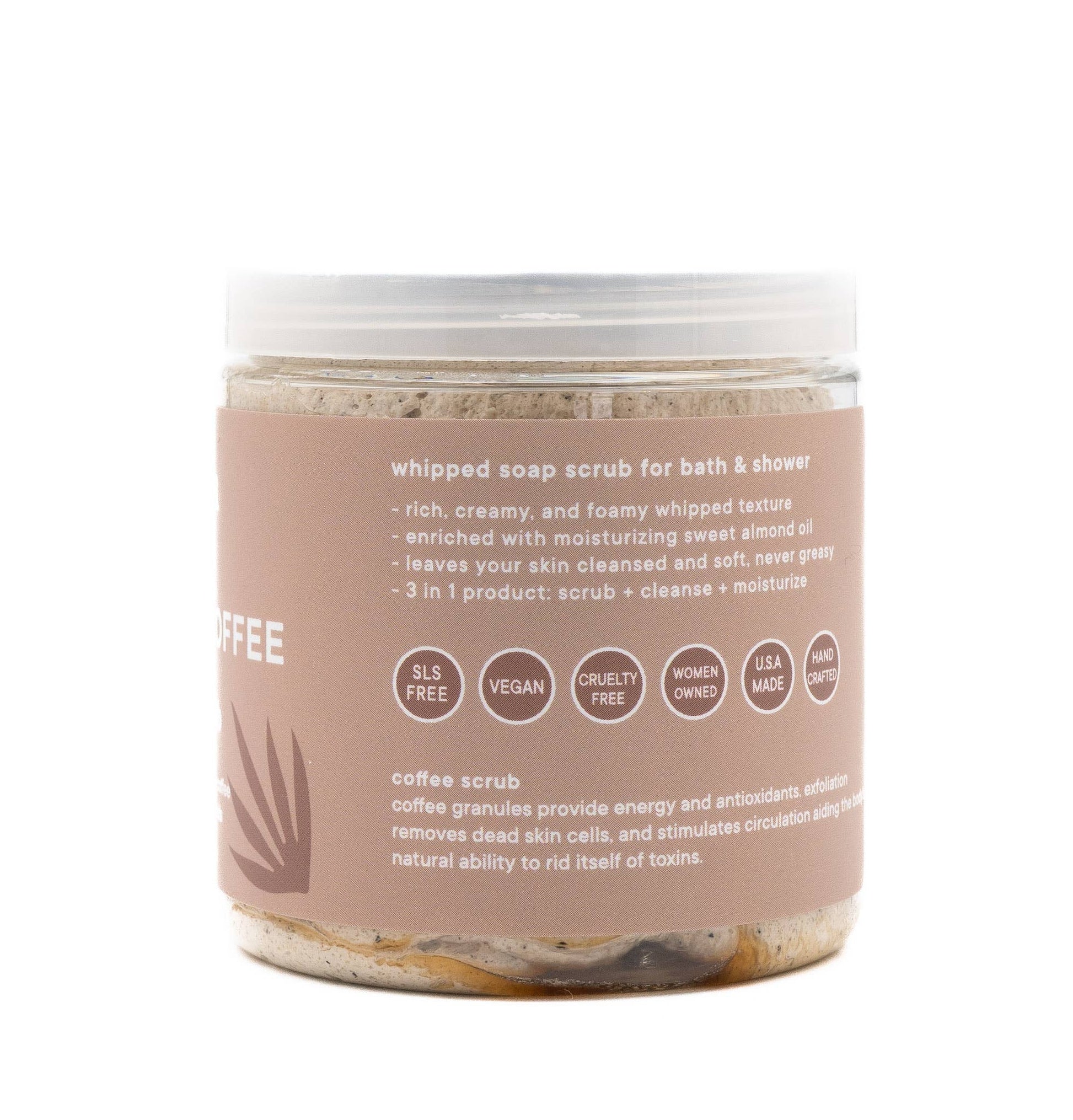 🤎 Whipped soap scrub for bath & shower. This unique bath experience is a whipped, fluffy texture with exfoliating sugar grains that lathers up and cleanses, scrubs, and moisturizes your skin - all in one jar!