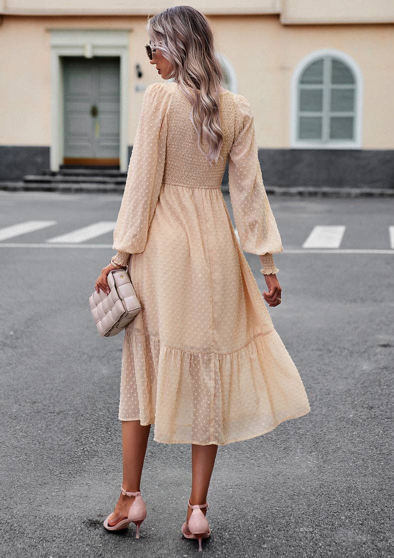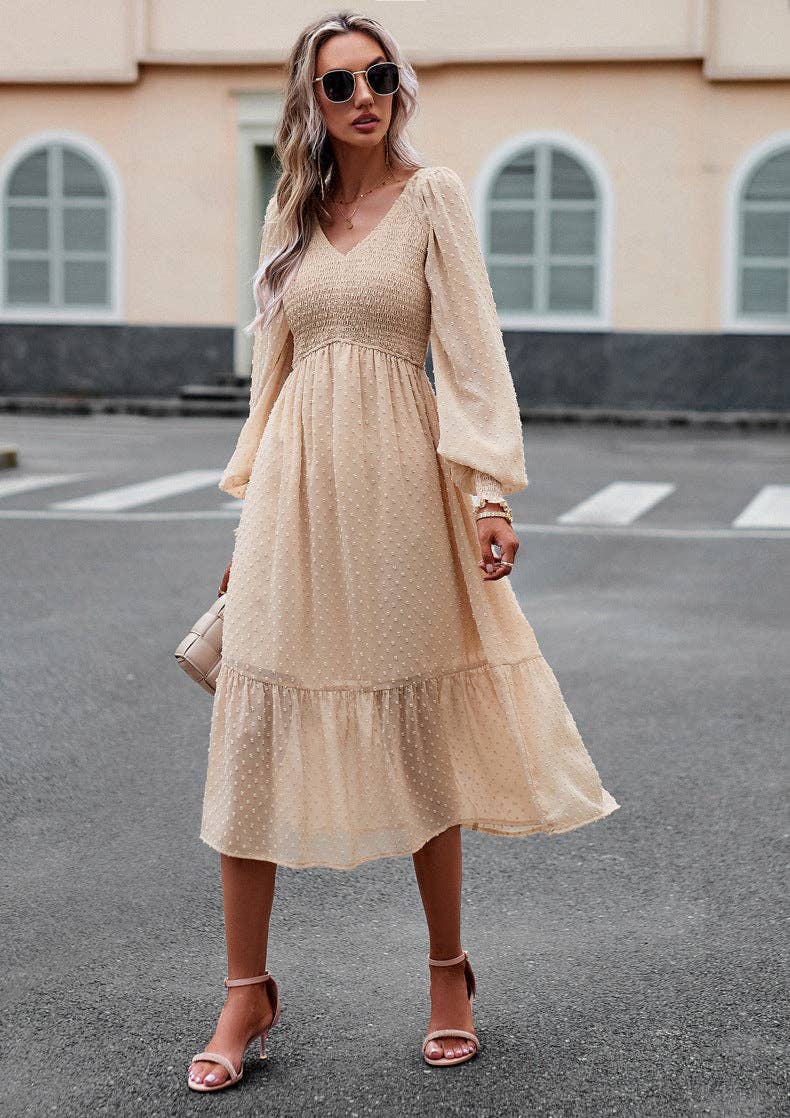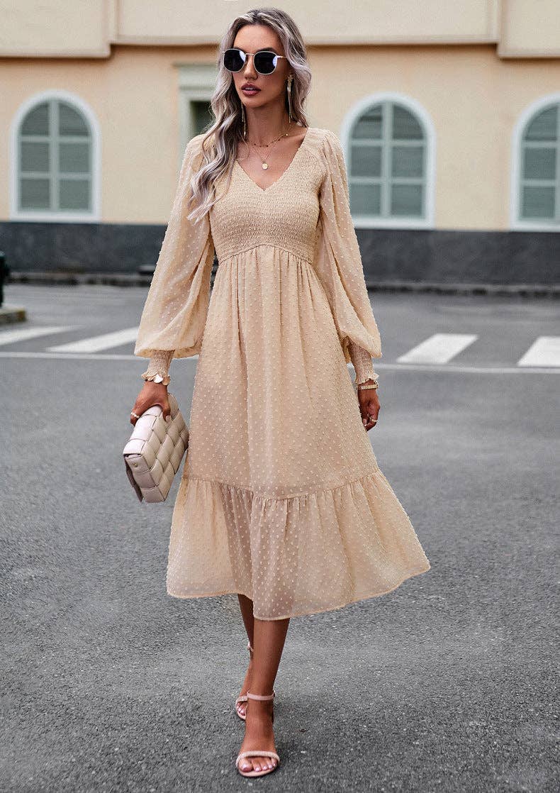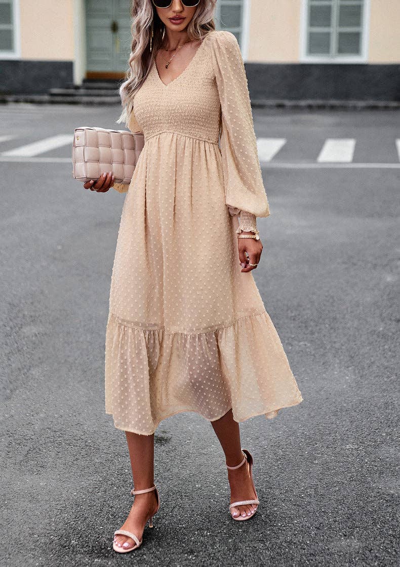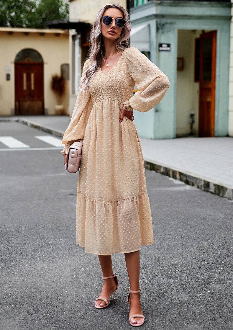 - Apricot Casual V-Neck Lantern Sleeve Long Dress