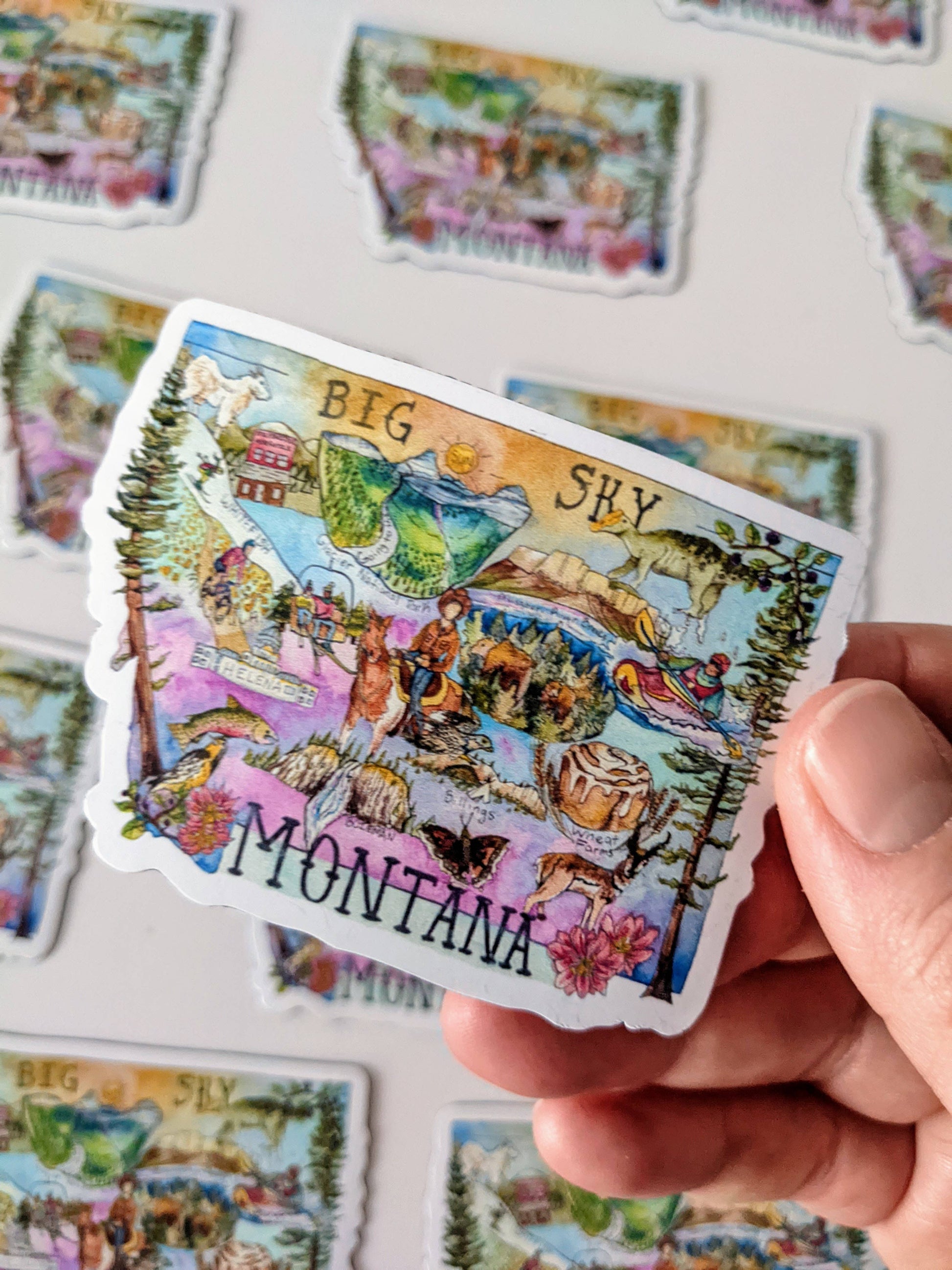 This Montana magnet is perfect to represent Big Sky Country. This Illustration includes Montana's state symbols like the flag, flower, animal, bird, and national parks like Glacier National Park. This Montana magnet will be a great souvenir or small moving gift to or from Montana.
