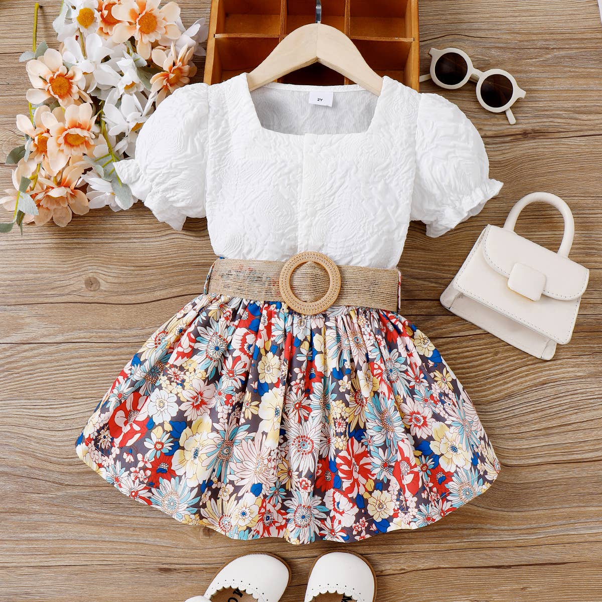 Square Neck Textured Top and Floral Belted Skirt Set