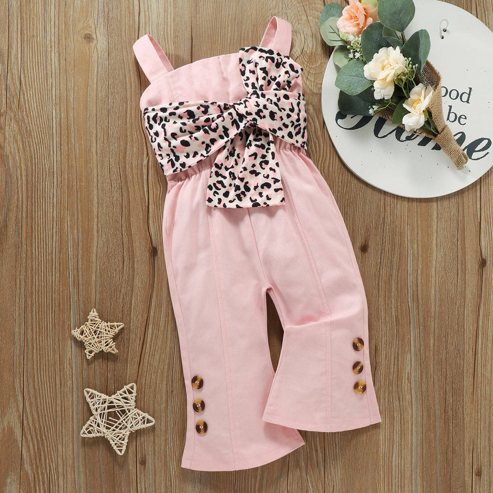 Denim Leopard Print Bow Decor Sleeveless Baby Overalls