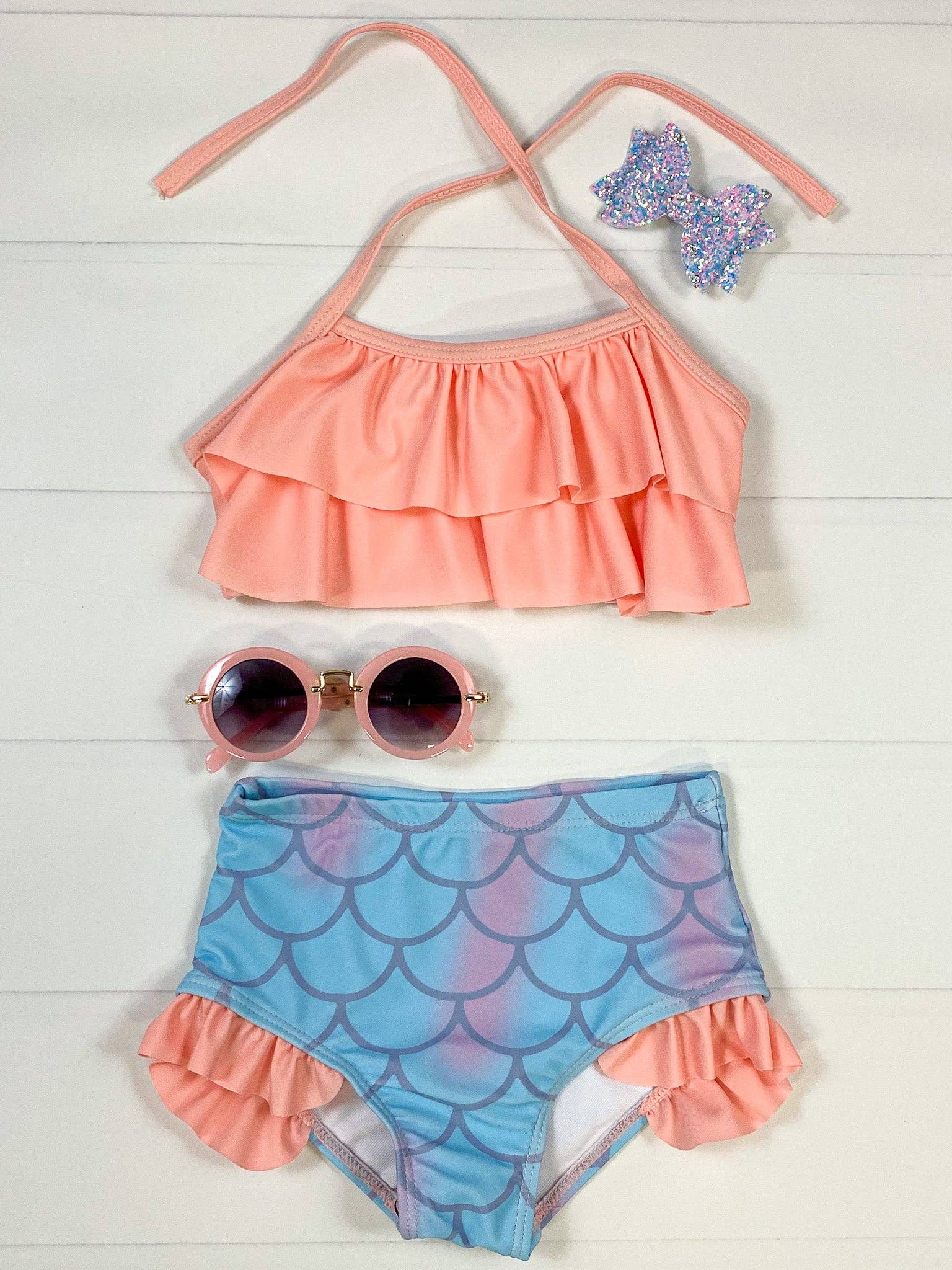 Ruffled peach layered halter top paired with purple and blue mermaid pattern with peach ruffles, high-waisted bikini bottoms.