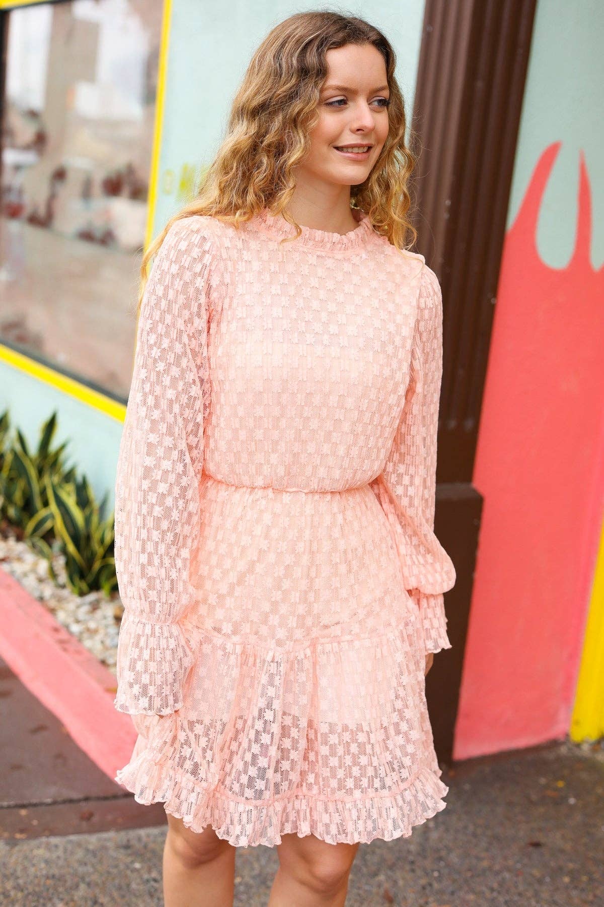 - Peach Pleated Lace Bubble Sleeve Lined Dress