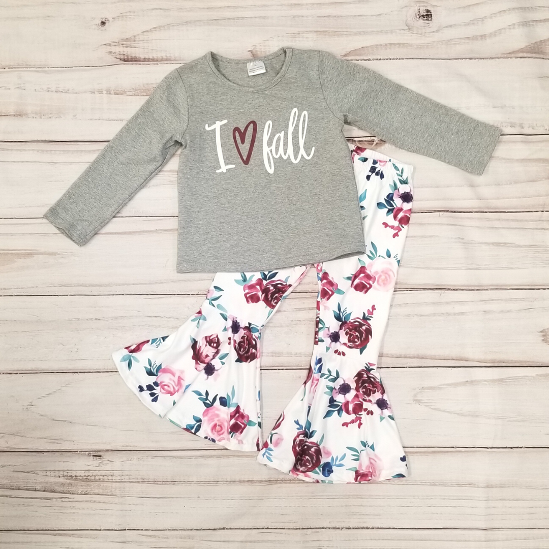 Soooo cute! The gray top with "I ❤️ Fall" printed in the center matches perfectly with the lovely floral print bell bottoms pants in shades of pink and burgundy.