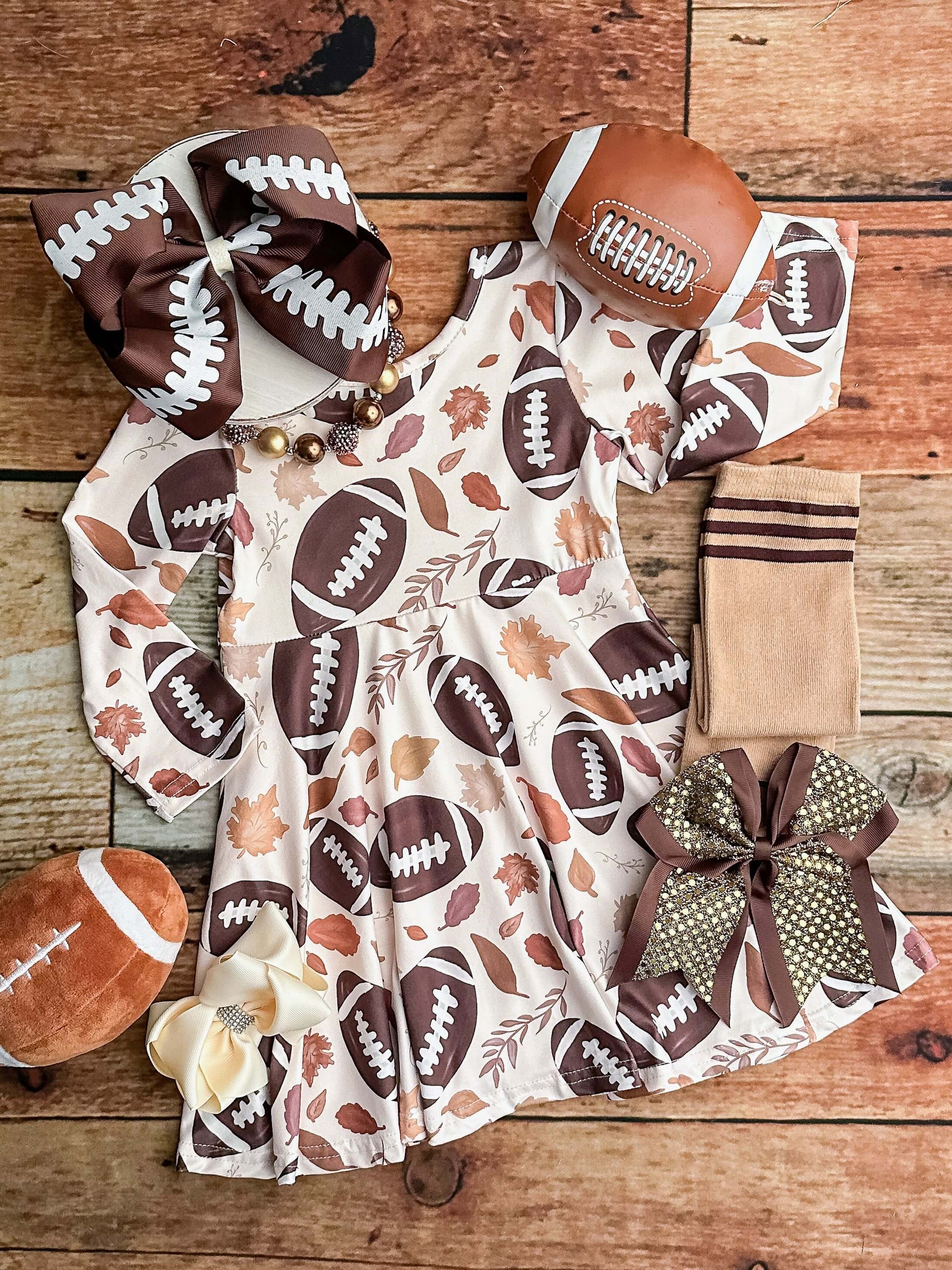 Dress your daughter in style with our Footballs and Leaves Fall Twirl Dress! This gorgeous dress combines the best of fall with its festive leaf print and bold football accents for a look that is perfect for any occasion. Let your daughter stand out with this adorable dress!