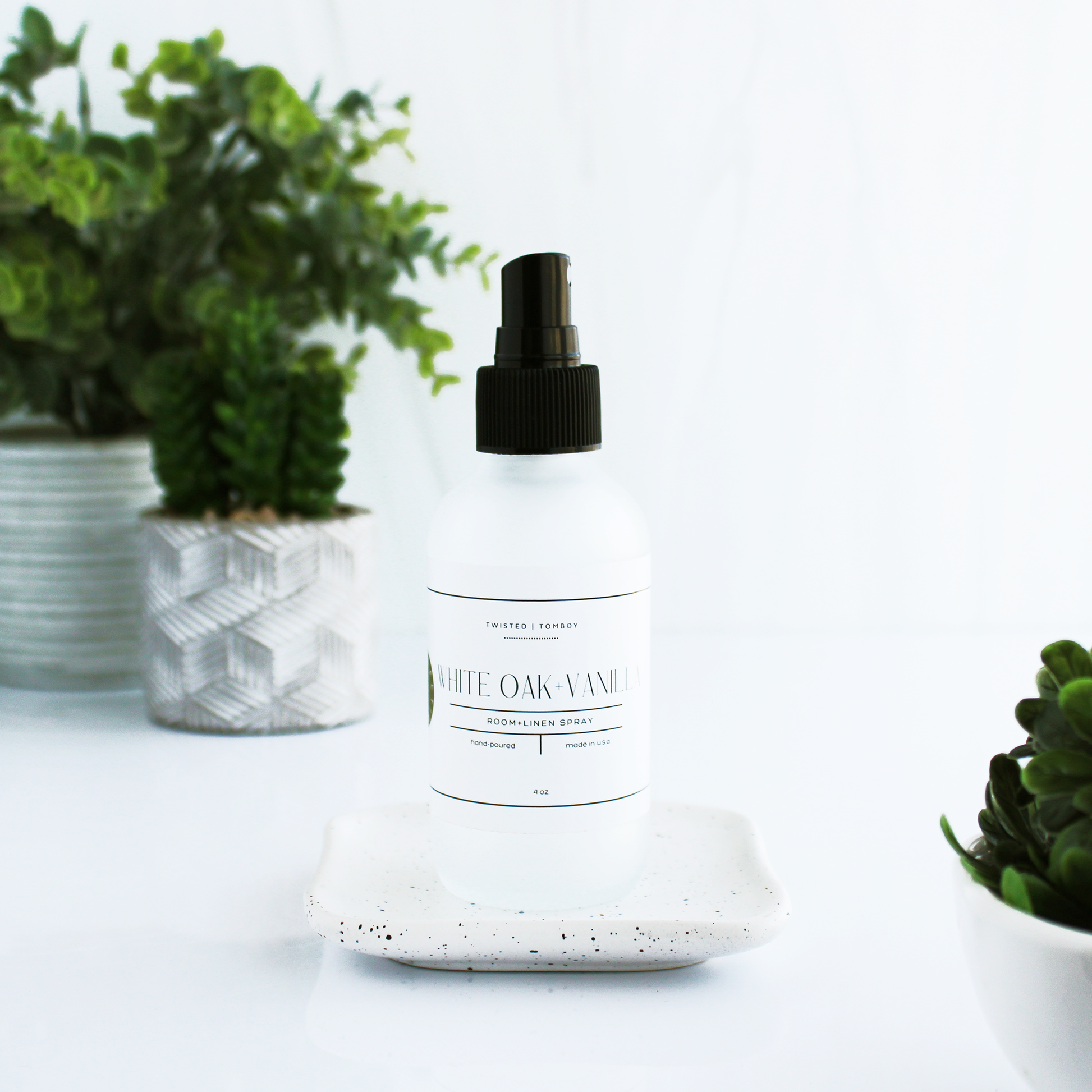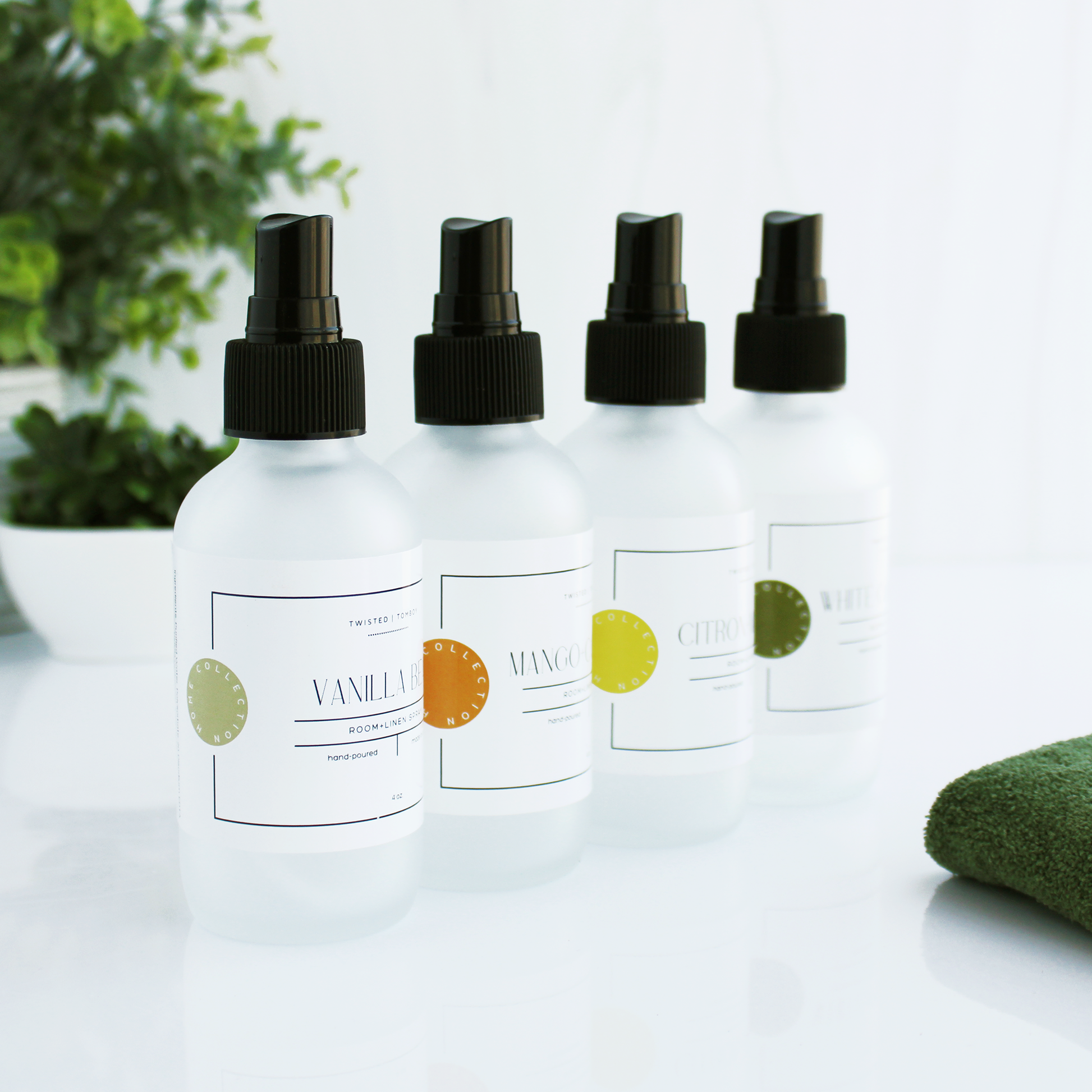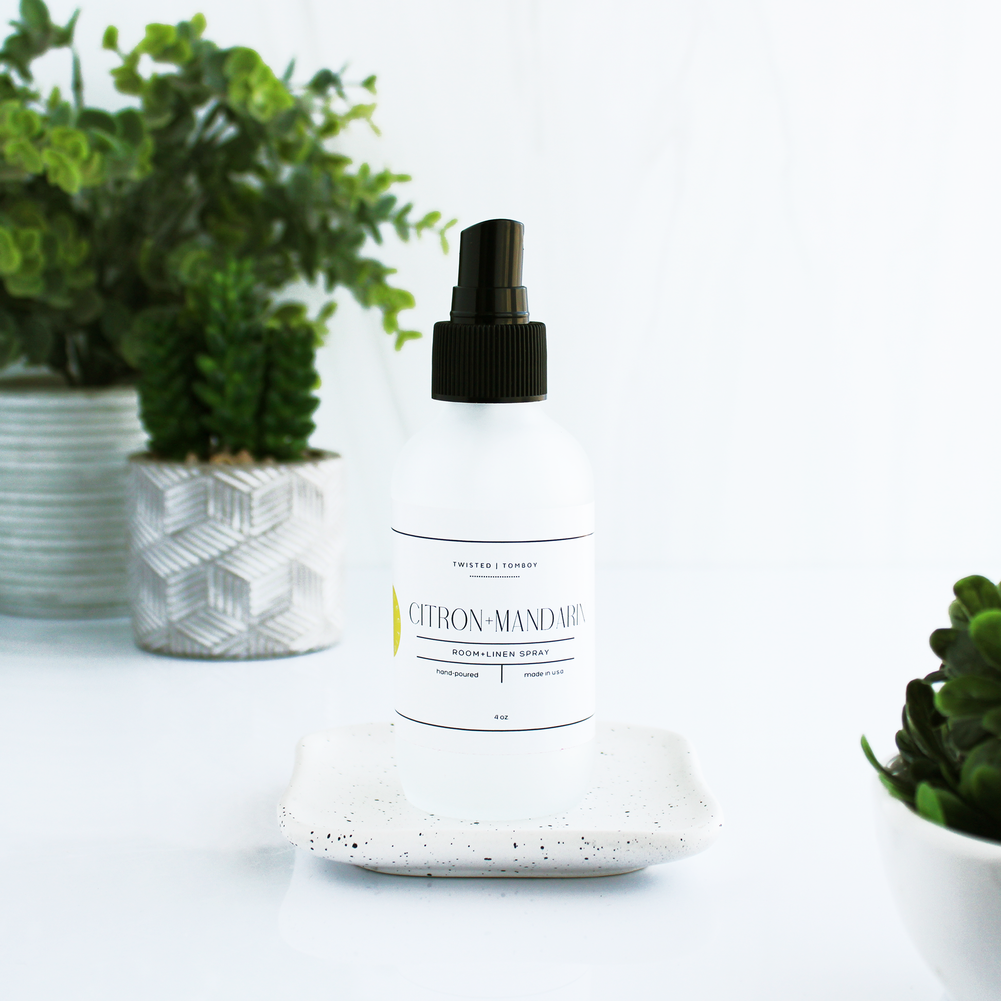 Room+Linen spray is now here. We have coordinated these scents with our new reed diffuser line to ensure your home will always smell amazing! These are a great way to do a quick refresh of any room, sheets, pillows, your office or in your car. Scents include: - Christmas - Fraser Fir - Mango+Tangerine - Citron+Mandarin - Vanilla Bean - White Oak+Vanilla Each Room+Linen spray comes in a frosted 4 oz. glass bottle with a black sprayer.