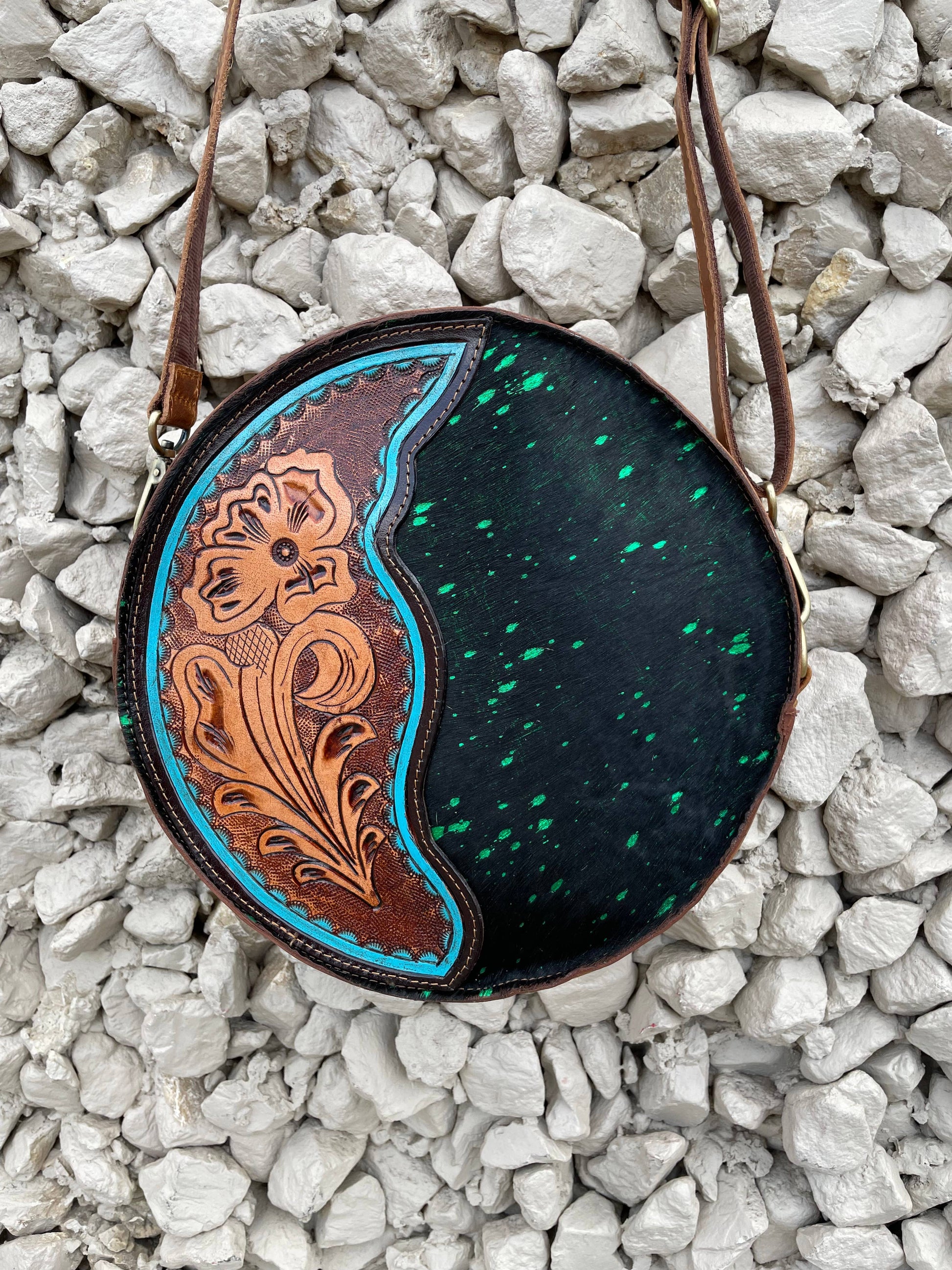 Hand crafted cowhide crossbody bag! Backside has a soft vintage leather with hand tooled design on the front with a mix of cowhide!