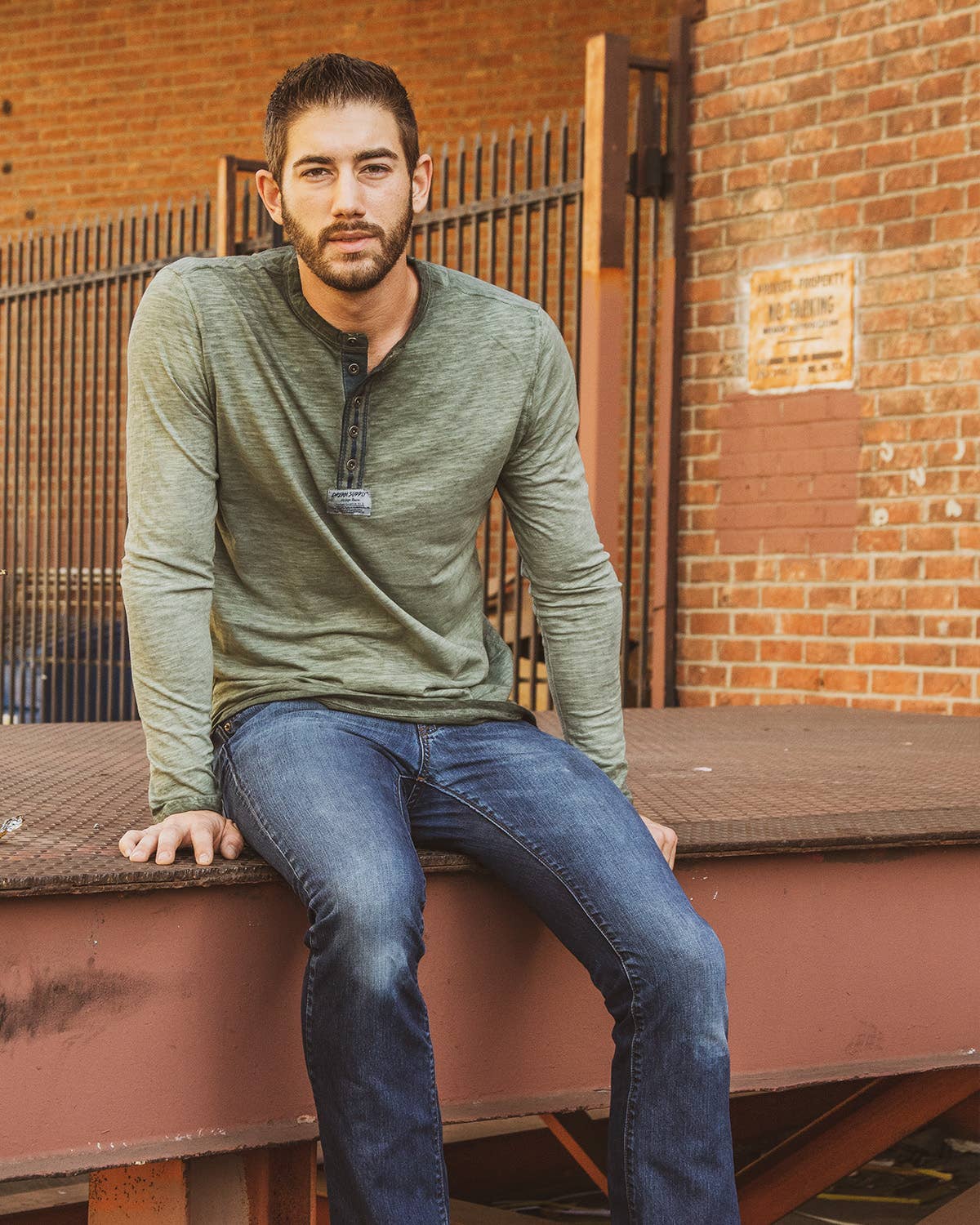 Men's long sleeve crew neck vintage garment dyed button henley t-shirt.